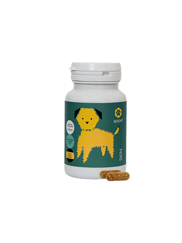 Apipet Skin ist eine natürliche Nahrungsergänzung in Kapselform für Hunde mit Haut- oder Fellproblemen. Es ist ideal für Hunde, die zu Allergien, Schuppen, Juckreiz, Hautveränderungen oder saisonalem Fellwechsel neigen.