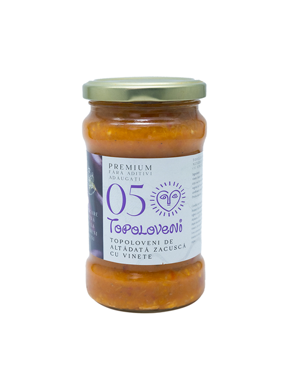 Die gerösteten Auberginen sind die Hauptdarsteller dieses köstlichen Brotaufstrichs. Jeder Bissen des Auberginen-Brotaufstrichs von Topolveni offenbart eine sorgfältig ausgewogene Kombination aus geröstetem Paprika, frischen Zwiebeln und Tomaten, angereichert mit Sonnenblumenöl und gewürzt mit leichten, aber sorgfältig dosierten Gewürzen wie Pfeffer und Lorbeerblättern.