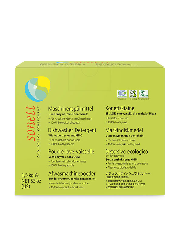 Das maschinelle Geschirrspülpulver von Sonett entfernt mit seinen feinen Körnern und Wirkstoffen aus pflanzlichen und mineralischen Rohstoffen alle hartnäckigen Flecken und Verschmutzungen und sorgt für strahlende Sauberkeit Ihres Geschirrs.