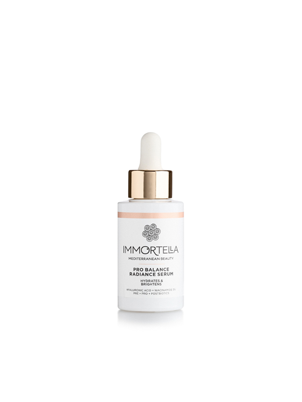Immortella Serum enthält einen patentierten Komplex aus Probiotika, Präbiotika, Postbiotika und Milchsäure. Die Probiotika im Serum tragen dazu bei, das Gleichgewicht der Mikroflora der Haut aufrechtzuerhalten, was bedeutet, dass sie weniger bakteriellen Infektionen und Entzündungen ausgesetzt ist. Außerdem tragen Probiotika zur Wiederherstellung der Hautbarriere bei, indem sie das Mikrobiom der Haut stärken, wodurch diese besser auf schädliche Umwelteinflüsse wie Luftverschmutzung, UV-Strahlen oder Stress reagiert.