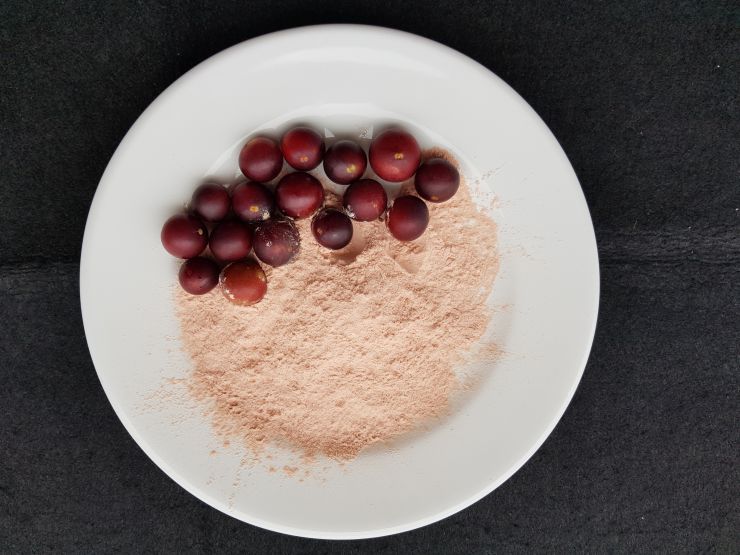 Frisches Camu Camu enthält etwa zwei bis drei Gramm Vitamin C pro 100 Gramm Frucht. Camu-Camu Pulver weist sogar rund 12 Gramm Vitamin C pro 100 Gramm Pulver auf. Damit enthält Camu Camu ein Vielfaches des Vitamin-C Gehalts von Orangen.