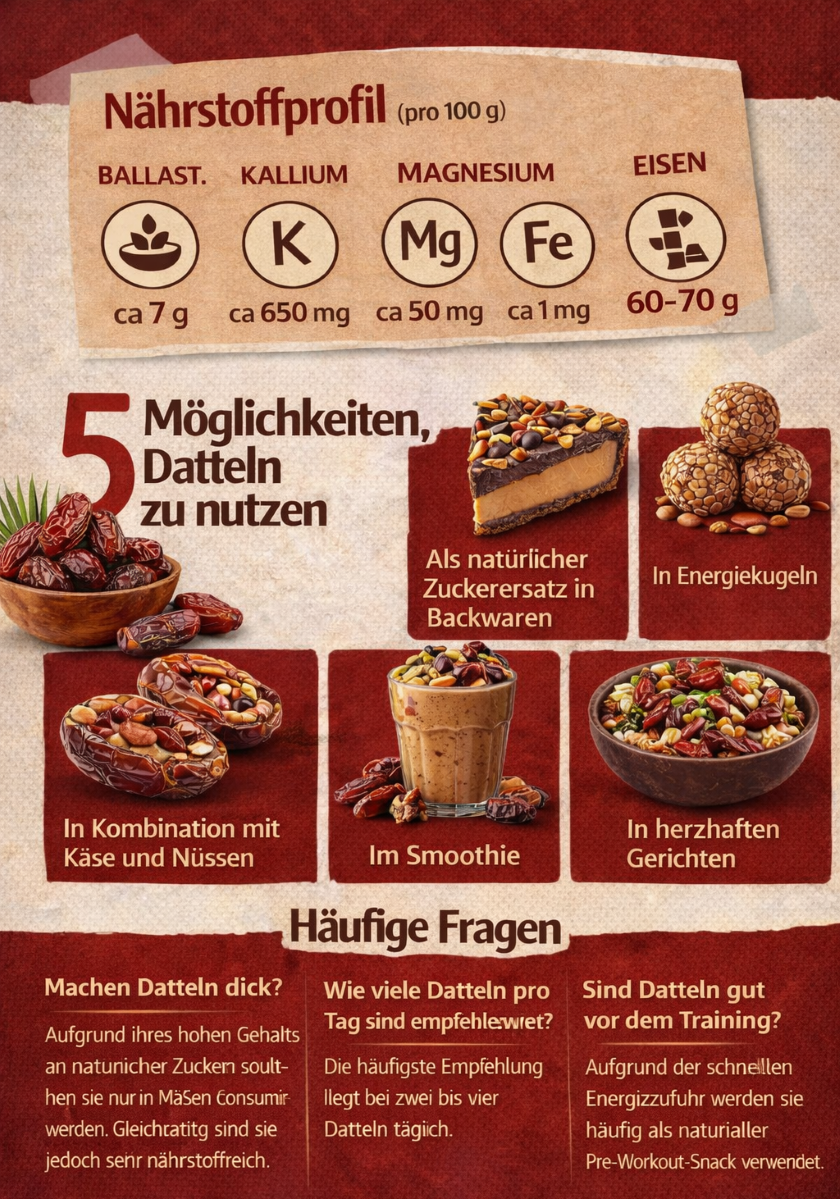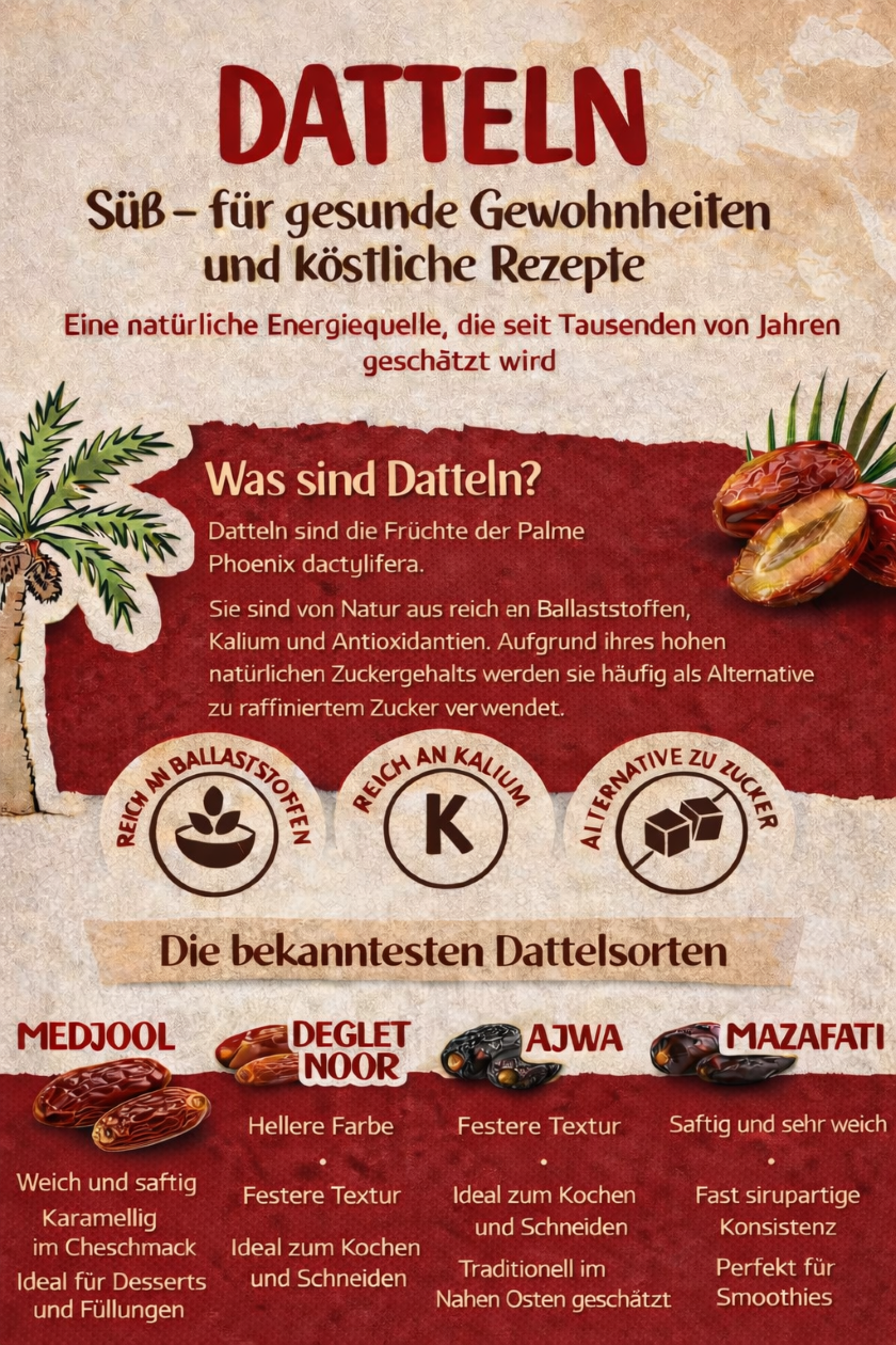 Ein Grund für ihre Beliebtheit ist ihr natürlich süßer Geschmack, der durch den hohen Gehalt an natürlichen Zuckern entsteht. Gleichzeitig zeigen Studien, dass Datteln zu den Lebensmitteln mit einem niedrigen glykämischen Index zählen. Sie verursachen daher keine abrupten Schwankungen des Blutzuckerspiegels. Gerade deshalb sind sie bei Menschen, die Wert auf eine bewusste und ausgewogene Ernährung legen, zu einer beliebten Zutat geworden und werden häufig als Alternative zu raffiniertem Zucker verwendet. Dabei dienen Datteln nicht nur als natürlicher Süßstoff, sondern helfen auch dabei, die Zutaten in vielen Rezepten zu einer harmonischen Masse zu verbinden.
