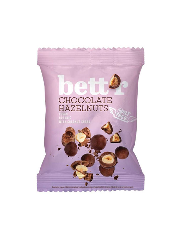 Hochwertige Haselnusskerne aus kontrolliert biologischem Anbau verpackt in Bett'r Päckchen mit einem unwiderstehlichen Schokoladenüberzug ergeben einen unvergesslichen Snack, dem man kaum widerstehen kann.