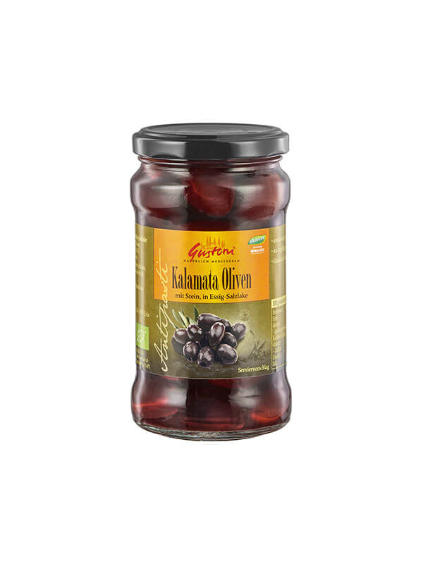 Kalamata-Oliven* (60%), Wasser, Meersalz (3,4%), Weißweinessig* (0,6%)