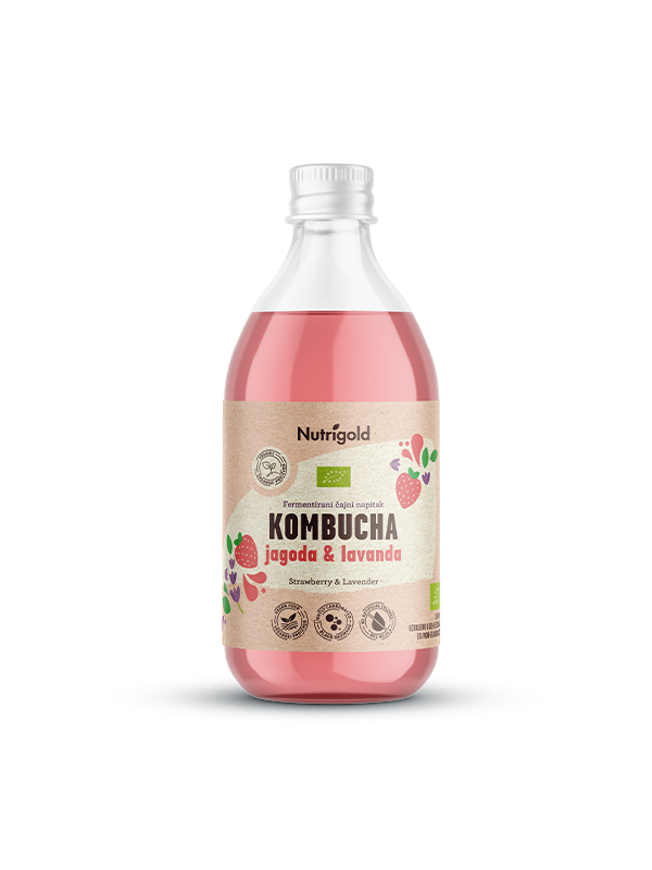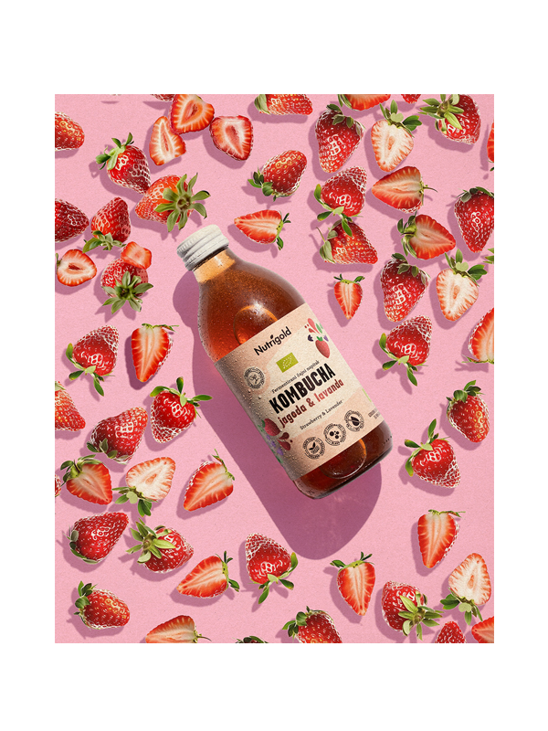 Verlieben Sie sich in den erfrischenden Nutrigold Kombucha mit Erdbeer- & Lavendelgeschmack!