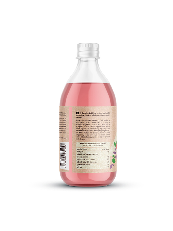 Fermentierter Kombucha* (Wasser, Grüntee-Getränk*, Zucker*, Kombucha-Kultur*), Erdbeer-Früchtetee-Getränk* und Lavendel* (Wasser, Zucker*, Erdbeer-Früchtetee*, Lavendel* 0,125 %), Kohlendioxid, natürliches Erdbeeraroma *