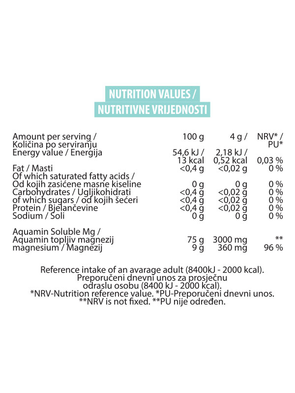 Aquamin Soluble MG, Säureregulator: Zitronensäure, natürliches Apfelaroma, Farbstoff: Färberdistel, Spirulina-Extrakt, Süßungsmittel: Sucralose
