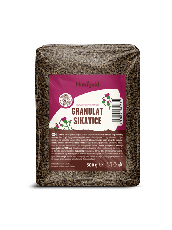 Das Nutrigold Mariendistel-Granulat ist ein 100 % rohes Granulat aus geschälten Mariendistelsamen (Silybum marianum) und wird durch einen sorgfältigen Prozess der Pressung von Mariendistelsamen gewonnen, der für die Gewinnung von Mariendistelöl notwendig ist.