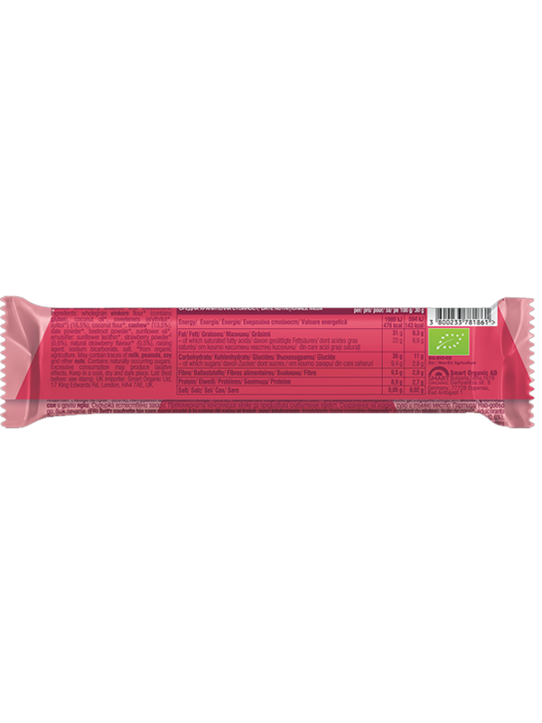 Weizenvollkornmehl*, Dattelpulver*, Kokosfett*, Cashewnüsse* 12%, Süßungsmittel: Erythrit*, Kokosfett*, Rote Bete Pulver*, Sonnenblumenöl*, Emulgator: Sonnenblumenlecithin*, Erdbeerpulver* 0,6%, natürliches Erdbeeraroma* 0,5%, Trennmittel: Natriumhydrogencarbonat, Salz.