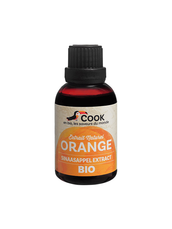 Die exzellente Qualität von Cook natürlichem Orangenextrakt wird durch heiße hydroalkoholische Extraktion aus 100 % Bio-Orangen gewonnen.