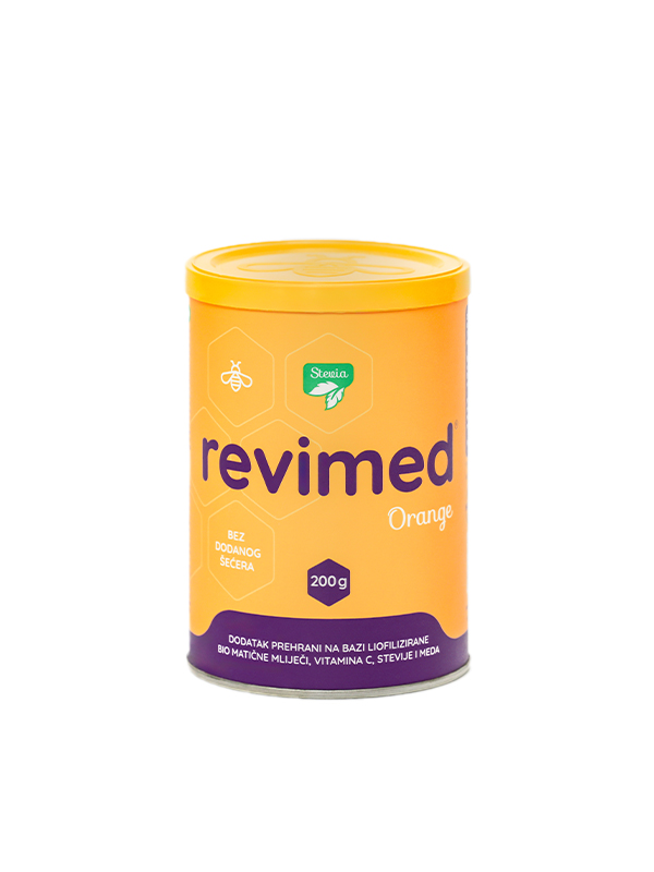 REVIMED Stevia Orange ist ein natürliches, hochwertiges Nahrungsergänzungsmittel auf Basis von gefriergetrocknetem BIO-Gelée Royale, dehydriertem Honig, Stevia und Vitamin C zur Zubereitung eines Getränks mit Orangengeschmack.