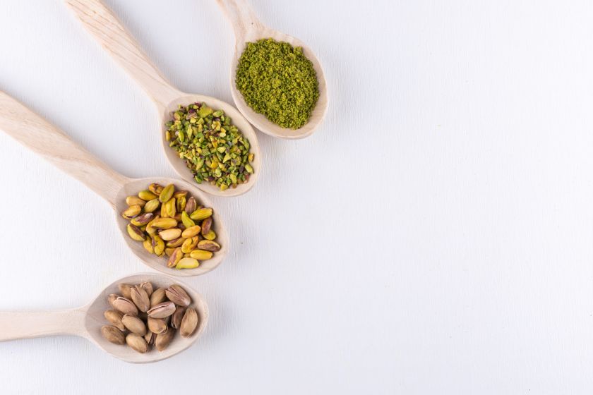 Pistazien sind besonders reich an Kalzium und Eisen, tragen zur Gesundheit von Knochen und Zähnen bei und sind eine gute Unterstützung für Menschen, die unter Eisenmangel-Anämie leiden. Dank ihres hohen Kaliumgehalts eignen sie sich auch für Personen mit Bluthochdruck. Zusammen mit Basilikum und Pinienkernen sind rohe Pistazien die perfekte Basis für ein außergewöhnliches Pesto.