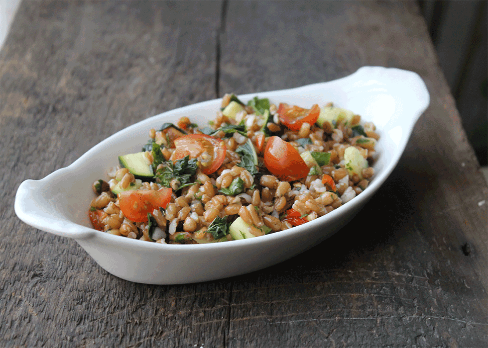 Gekochter Dinkel hat eine lockere Konsistenz und ist vielseitig verwendbar, beispielsweise in herzhaften oder süßen Gerichten, in Suppen, Salaten oder Aufläufen. In diesem Rezept kombinieren wir ihn mit Kichererbsen, Tomaten und Zucchini zu einer einfachen, aber nährstoffreichen Mahlzeit.