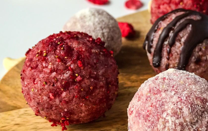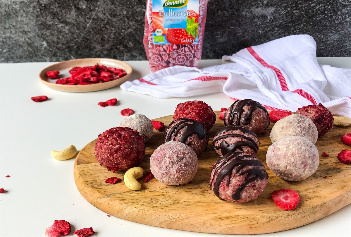 Nur wenige Minuten im Mixer und ein kurzes Formen mit den Händen – schon sind sie fertig. Einer der Hauptbestandteile dieser runden Leckereien sind gefriergetrocknete Erdbeeren. Lassen Sie sich nicht von diesem kompliziert klingenden Namen verwirren. Solche Erdbeeren sind perfekt für einen gesunden Genuss. Sie sind knusprig, tiefgefroren getrocknet und werden Sie mit ihrem einzigartigen Geschmack und Aroma erobern.