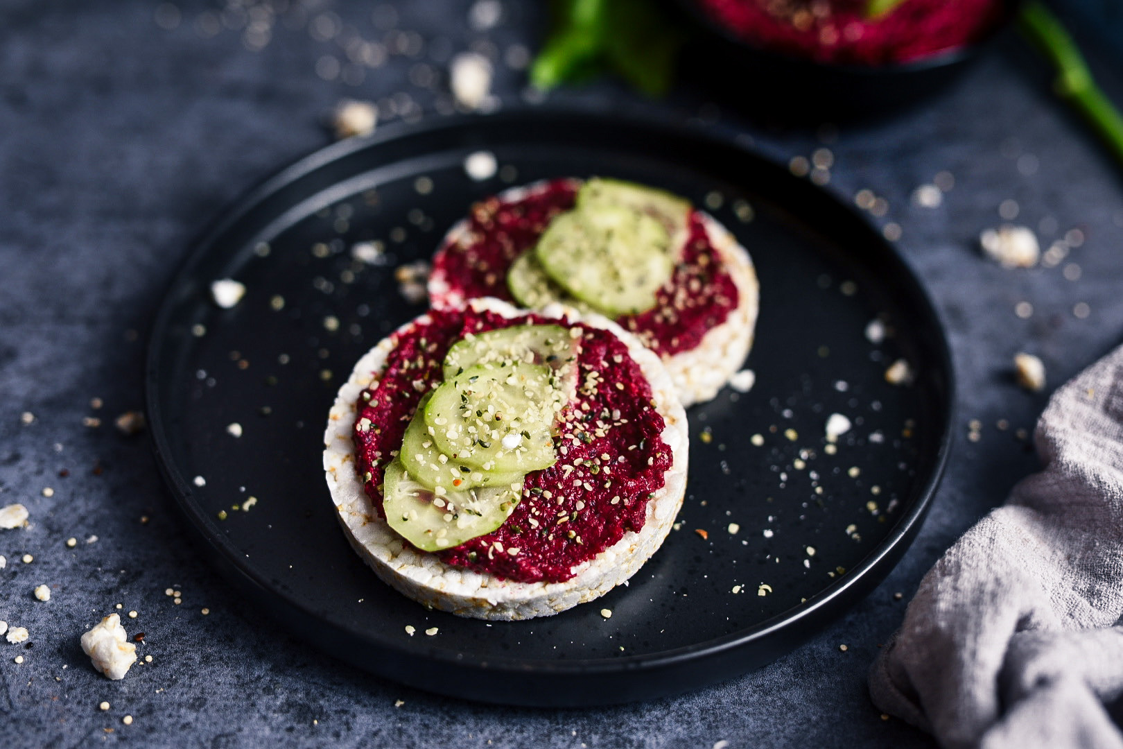 Endlich haben wir sie kombiniert und zusammen mit Knoblauch und Tahini eine kleine Köstlichkeit kreiert, die perfekt zu Reiswaffeln passt. Wenn Sie es lieber etwas herzhafter mögen und Lust auf einen sättigenden Snack haben, probieren Sie den Aufstrich am besten auf einer warmen Scheibe Roggenbrot. Heizen Sie den Ofen vor, schälen Sie die Rote Bete – und schon sind Sie fast am Ziel. Einfacher geht es kaum.