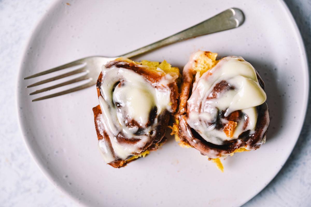 Doch die eigentliche Magie kommt am Ende: der cremige Ahornsirup-Frischkäse-Guss, der die Zimtschnecken vollendet. Die Kombination aus Ahornsirup, Mandelmilch und Frischkäse schmilzt leicht auf den warmen Rollen und schafft eine perfekte Balance zwischen Süße und Cremigkeit – ein Genuss, dem man kaum widerstehen kann.