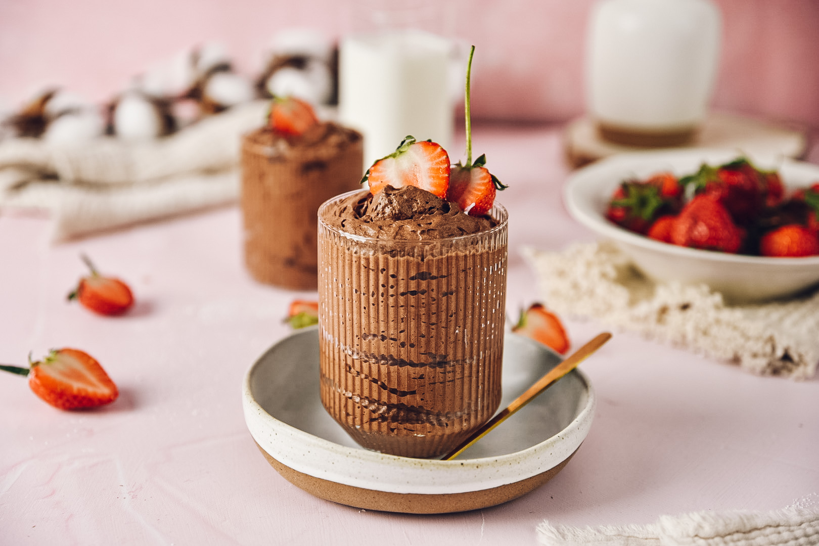 Die gute Nachricht: Dieses vegane Mousse ist im Handumdrehen zubereitet und lässt sich wunderbar mit Erdbeeren, Beeren oder einem Spritzer Schokolade dekorieren.