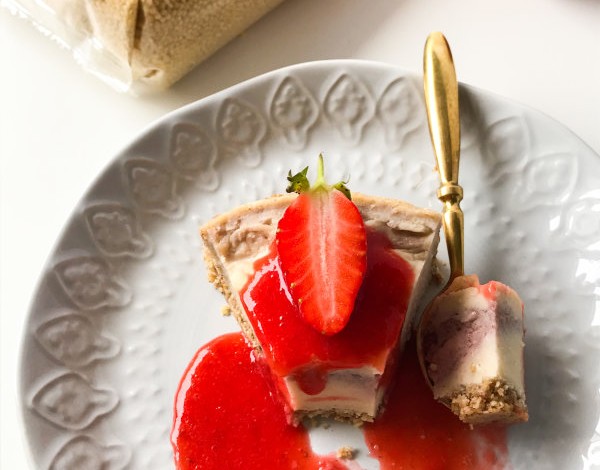 Solange noch Erdbeersaison ist, servieren Sie diesen veganen Cheesecake mit Erdbeertopping und überraschen Sie alle Liebhaber süßer Desserts mit einem gelungenen Genuss.