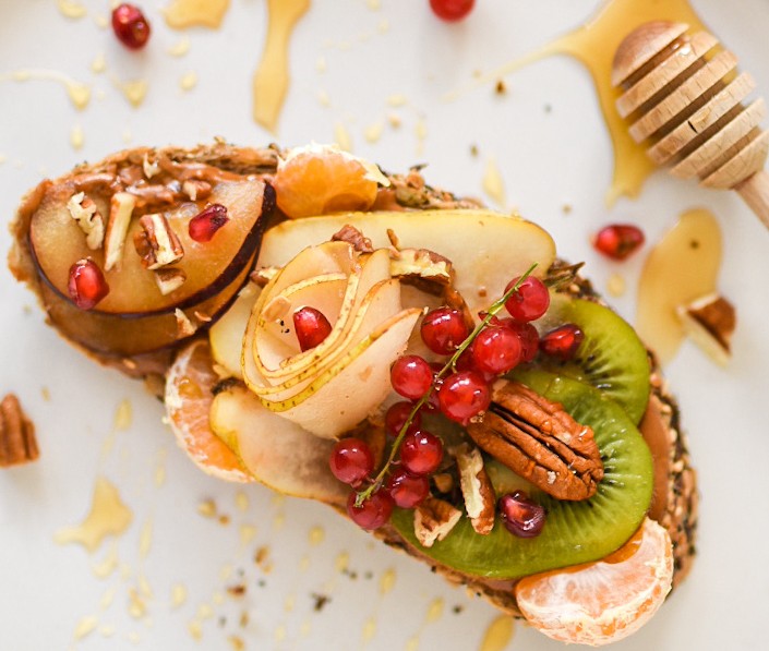 Diese Version kombiniert Mandelbutter und frisches Obst, doch Sie können nach Geschmack variieren und Ihre Lieblingszutaten hinzufügen.