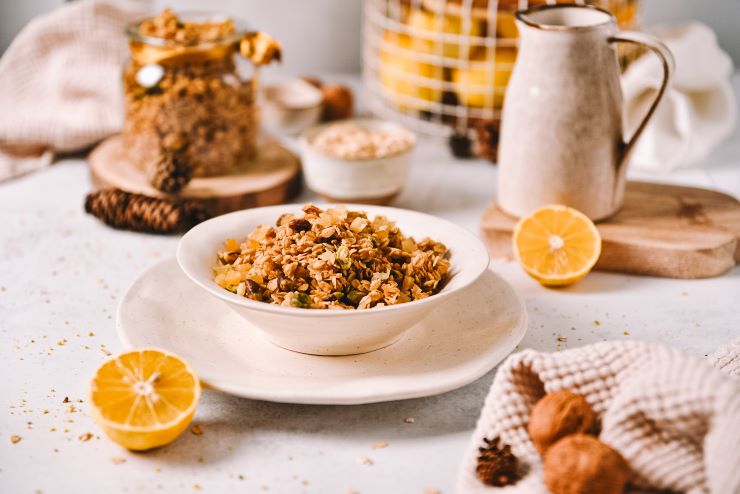 Jeder Bissen offenbart eine harmonische Verbindung von Texturen und Aromen und gibt Ihnen Energie für einen perfekten Start in den Tag oder als leckeren Snack. Dieses Granola ist nicht nur köstlich, sondern auch eine nährstoffreiche Option für das Frühstück oder als Snack. Die Zitrone sorgt für Frische und Vitamin C, während die Pistazien gesunde Fette, Proteine und Ballaststoffe liefern. Ohne Zuckerzusatz vereint dieses Granola Gesundheit und Genuss perfekt.