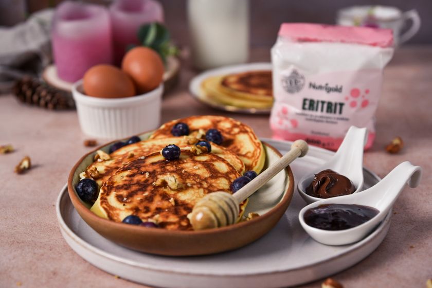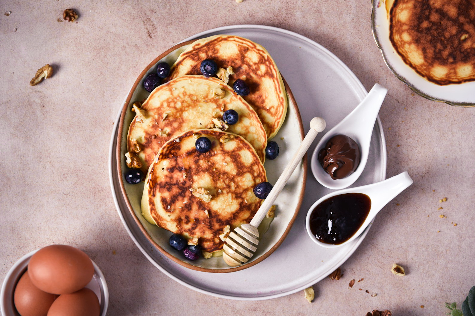 Besonders gut passen dazu Heidelbeermarmelade mit Stevia, Schokoladenaufstrich oder Erdnussbutter. Natürlich können Sie die Pfannkuchen auch mit Honig, Ahornsirup, Nüssen und frischem Obst servieren.