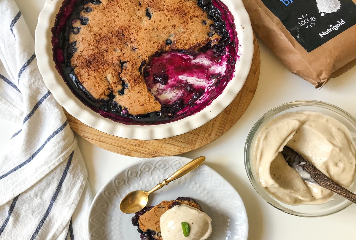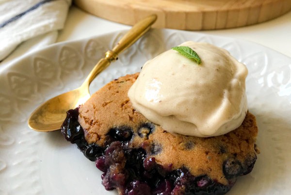 Ein Cobbler ist im Grunde eine Art Obstkuchen ohne Boden. Das Obst wird in eine Form gegeben und mit einem Teig aus Mehl, Fett und pflanzlicher Sahne bedeckt. Anschließend wird alles gebacken, bis die Oberfläche goldbraun ist und das Obst seine Säfte freigibt – so entsteht ein wunderbar fruchtiges Dessert. Am ehesten erinnert Cobbler an einen Crumble, ist aber etwas saftiger und in unserer Variante auch etwas leichter.