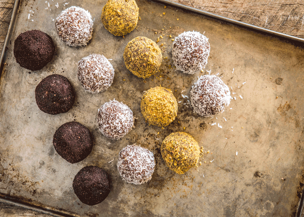 Ideal ist es, die Kugeln in Kokosraspeln, Kakaopulver oder Mandeln zu wälzen und natürlich Genießen!