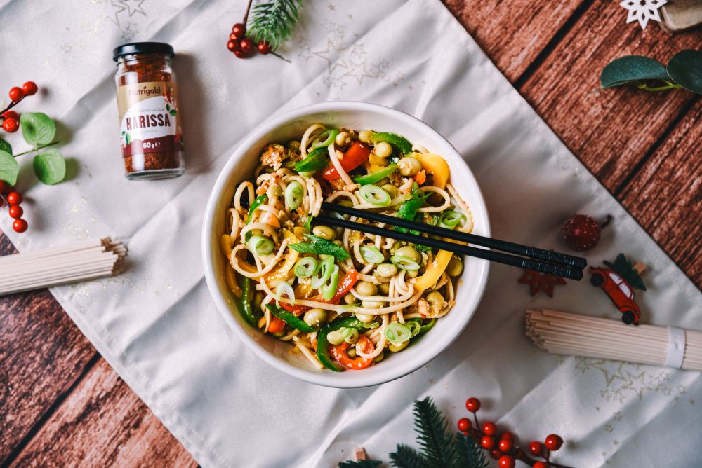 Das Rezept bietet die perfekte Balance aus Schärfe, feiner Süße und reichhaltigen, nussigen Noten. Die Kombination aus Udon-Nudeln, frischer Paprika und knackigen Erdnüssen sorgt für ein harmonisches Spiel der Texturen und verwöhnt so all Ihre Sinne. Mit den intensiven Noten von Harissa, aromatischen Umami-Gewürzen und einem Hauch Ahornsirup wird jeder Bissen zu einer kleinen Geschmacksexplosion.
