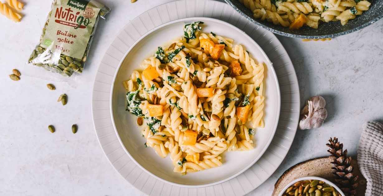 Gibt es jemanden, der Pasta nicht zu seinen fünf Lieblingsgerichten zählt? Das ist kaum vorstellbar! Denn Pasta passt sich jedem Geschmack, jedem Lebensstil und sogar jeder Jahreszeit an. Im Herbst präsentiert sie sich in einem besonderen Gewand mit warmen, nussigen Noten vom Kürbis und der Frische unseres Lieblingsspinats. Die cremige Textur wird in diesem Rezept durch die knusprig gerösteten Kürbiskerne noch spannender. Ein vollmundiges Gericht, das an grauen Herbstnachmittagen wohltuend wärmt!