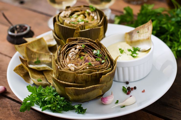 Artischocken werden traditionell als Salat serviert. Sie sind das ganze Jahr über auch eingelegt oder in Salzlake erhältlich und eignen sich frisch hervorragend als aromatische Beilage aus dem Ofen.