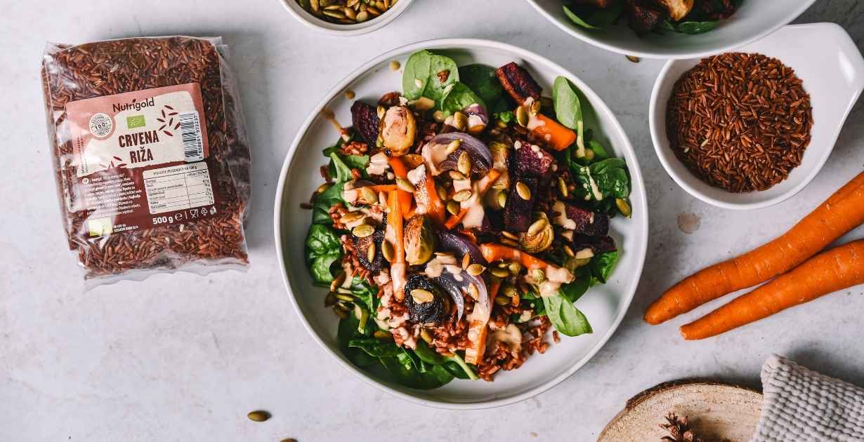 Rote Nägel, burgunderrote Accessoires – wir verstecken nicht, dass Rot unsere Lieblingsfarbe dieser Saison ist! Und wir wollen sie auch auf dem Teller sehen! In dieser Saison servieren wir sie in Form von rotem Reis, der aufregenderen Variante des beliebten Kohlenhydrats. Er ist reich an Vitaminen und Mineralstoffen und wird durch die Fermentation von gewöhnlichem Reis gewonnen. Diese Zutat verdient mehr als genug Aufmerksamkeit!