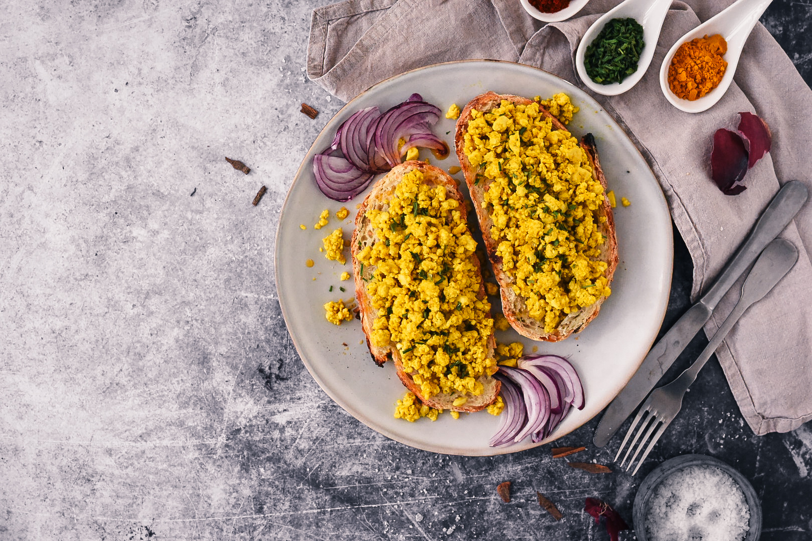 Zerbröselter Tofu mit einem Schuss Pflanzendrink – meist Sojadrink – sorgt für die typische, saftige Rührei-Textur, wie wir sie alle vom Frühstückstisch kennen. Wenn Sie auch geschmacklich ganz nah ans Original kommen möchten, greifen Sie zu einer besonderen Zutat: schwarzes Salz (Kala Namak). Es riecht intensiv, verleiht dem Gericht aber das authentische „Ei-Aroma“.