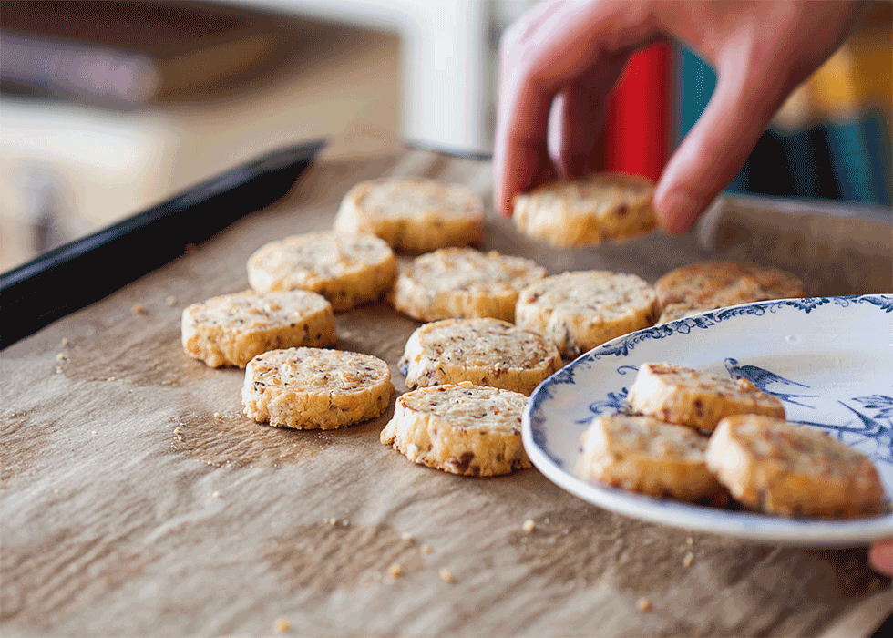 - Die Kekse auf ein mit Backpapier ausgelegtes Blech legen, mit Eigelb bestreichen und mit Sesam (oder Hanfsamen) bestreuen.