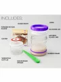 Die Packung enthält einen Mehrzweckbehälter, einen Ring, ein Glas, einen Radiergummi, einen Messlöffel, eine Gäruhr, eine Verschlussscheibe, einen Deckel und eine Gebrauchsanweisung.
