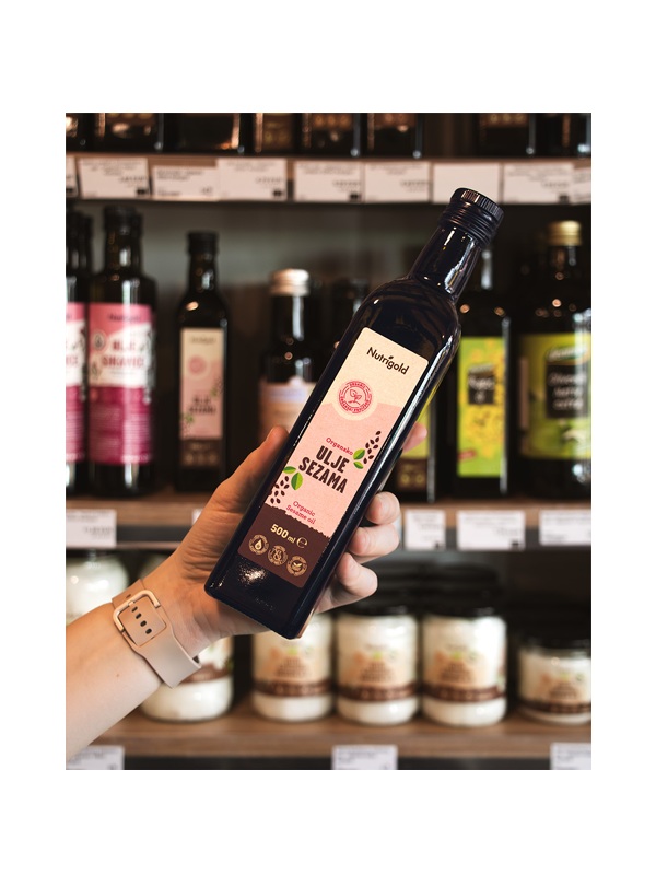 Nutrigold-Sesamöl wird durch Kaltpressung aus Sesamsamen aus biologischem Anbau gewonnen, so dass alle wertvollen Inhaltsstoffe der Samen selbst in das Öl übergehen und der Nährwert erhalten bleibt.