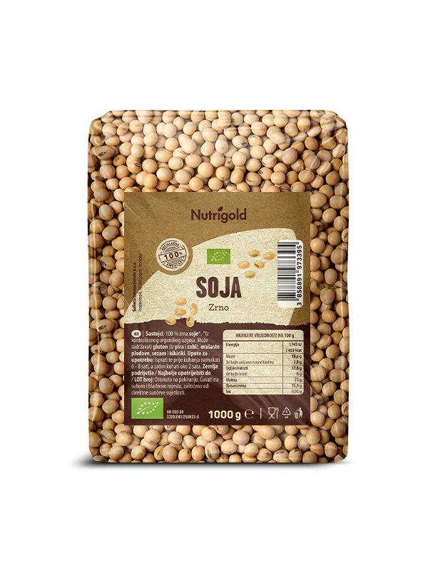 Nutrigold Soja ist zu 100 % aus biologischem Anbau und garantiert den hochwertigen Verzehr dieser wertvollen Hülsenfrucht, die mit ihrem Nährstoffreichtum in jedes Rezept einfließt.
