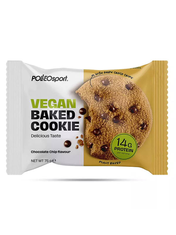 Der vegane Proteinkeks mit Schokoladenstückchen von Polleo Sport ist in einer praktischen Verpackung erhältlich, die in jede Tasche passt.